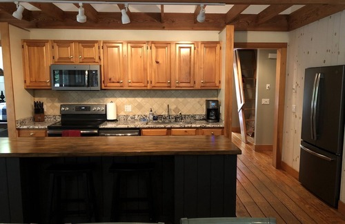 The kitchen is well stocked with anything you might need. No bare bones kitchen in this house like you might find in your typical rental! Among other items, the kitchen has two regular 14 cup coffee makers and a Kurig to make that morning cup of Joe a snap. Plenty of pots and pans to help cook for your large group, kitchen gadgets, pancake griddle, crock pot (to make your favorite chili on a cold winter day!) dishwasher and plenty of plates, bowls, glasses and mugs to go around! A second refrigerator & stove on the lower level come in handy when trying to feed your large group!