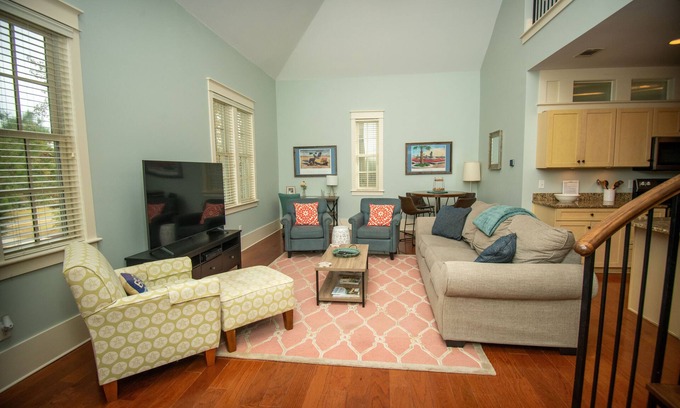 The Coastal Calm Condo is a beautiful two-bedroom condo located in the Southern Living inspired community of Habersham. It is pet-friendly and well equipped for short and long-term rentals. The freshly painted condo offers coastal chic décor, new furnishings, and a large screened-in porch. With a modern open floor plan, it is ideal for family and friend gatherings.