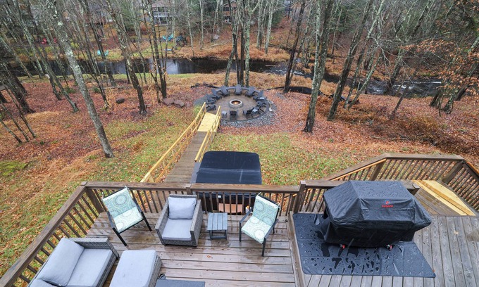 Looking for a beautiful retreat? This Pocono Lake house is located 4 minutes walking distance from a beautiful lake, heated pool, and a tennis court. It includes 6 inviting bedrooms, including 4 king beds, 2 cribs, 1 queen bed, and 3 bunk beds. Other amenities include a hot tub, pool table, ping pong, foosball, kayaks, and a gorgeous fire pit with 16 chairs overlooking Trout Creek. Escape to this fantastic retreat and create unforgettable memories with your loved ones. We look forward to welcoming you to our place.