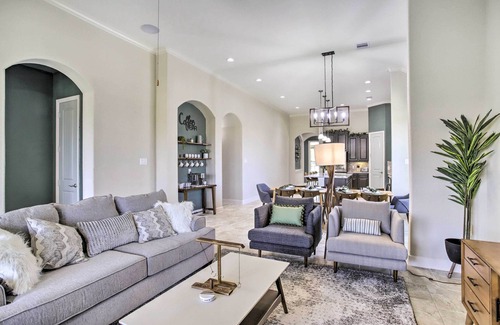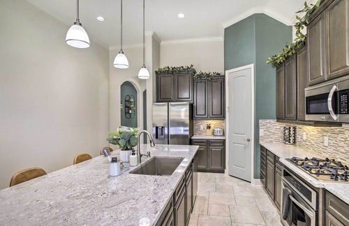 Prepare for a relaxing retreat in this modern 4-bedroom, 3-bath vacation rental. Located in the reputable Fairfield community and fitted with a private backyard, a full kitchen, and a coffee bar, this Cypress home is all you need to elevate your vacation. Whip up a barbeque on the grill, chill on the patio, and lounge in the fenced yard uninterrupted. Plus, the entertainment room is stocked with a pool table, popcorn maker, snacks, and a large projector screen to make any night-in a blast.