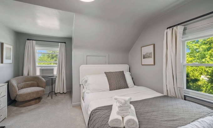 In addition to the six (6) queen beds, our space features two queen size pullout couches (one on the main level and one in the upstairs unit), two queen-sized air mattresses (main level and upstairs) & a twin size air mattress (basement). Plenty of extra linens and pillows are available to ensure groups of any size have a comfortable, restful stay.