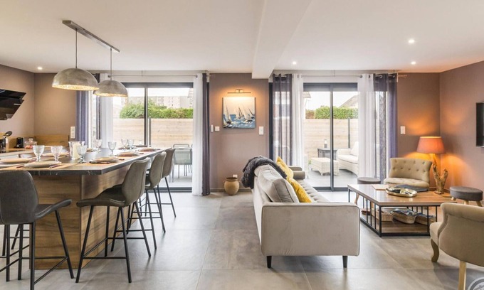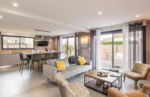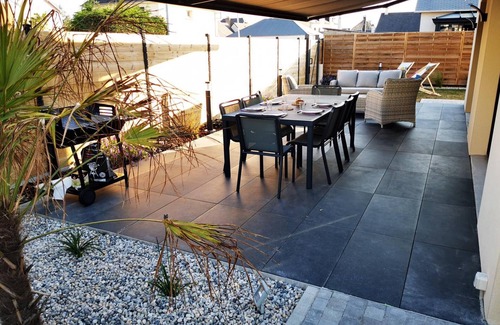 Detached house. Entrance with wardrobe and Bonzini table football. Living room (TV, internet access, smart speaker) with open kitchen (oven, induction hob, dishwasher, refrigerator with freezer, microwave, espresso machine). Bedroom 1 (1 bed 160X200) with private bathroom (walk-in shower). Separate toilet. Relaxation room with 4-person sauna. Laundry room (sink, washing machine, dryer). Upstairs, bedroom 2 (bed 180X200), bedroom 3 (1 bed 160x200), bedroom 4 (2 beds 90x190), separate toilet, bathroom with shower (blue tooth speaker), storage room. Baby equipment on request. Central heating included. All charges included. Bed linen for hire. Towels provided. Beds made on arrival. Cleaning service included. Private enclosed garden. 2 terraces, one with Bahn awning. Garden furniture. Barbecue. Plancha. Pierrade. Raclette set. Deckchairs. Pétanque court with lighting. Private parking. Pets allowed with the owners' consent. Located in a quiet cul-de-sac, the owners have completely renovated and redesigned this spacious house and its enclosed garden. Compliant with BBC standards, this property offers perfect conditions in all seasons. The amenities are remarkable, including the two beautiful bathrooms and the sauna room. The ground floor bedroom is also very pleasant with its direct access to the terrace. You'll enjoy a perfectly enclosed garden with a pétanque court for your moments of relaxation. Those who lose can always try to get their revenge with a game of foosball! Ideal for exploring Granville, the Bay of Mont St-Michel, and the West Cotentin region with family or friends during a stay, this house is a prime location in the seaside resort.