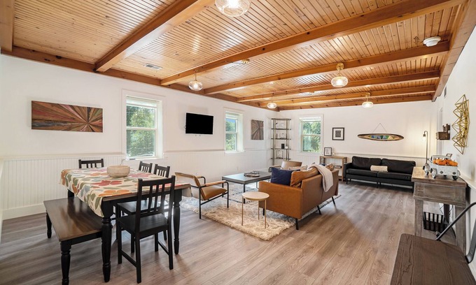 Welcome to your new home in the heart of Douglas, MI! This stunning apartment located on the 2nd floor offers all the comforts you could ever want. As you enter, you'll be greeted by the spacious living room with a smart TV and cozy seating area. The natural light floods in through the large windows, creating a warm and inviting atmosphere throughout the apartment. The modern bathroom boasts a spacious shower and sleek fixtures, providing a spa-like experience right at home. With high-speed internet, this apartment is perfect for remote work or simply staying connected. The full kitchen is equipped with everything you need to whip up delicious meals, while the dining area is perfect for entertaining guests. Retreat to one of the two bedrooms, featuring a luxurious king bed and a comfortable queen bed. Convenience is key with amenities such as a washer and dryer, wifi, and designated parking. Whether you're looking for a weekend getaway or a long-term stay, this apartment is sure to exceed your expectations.