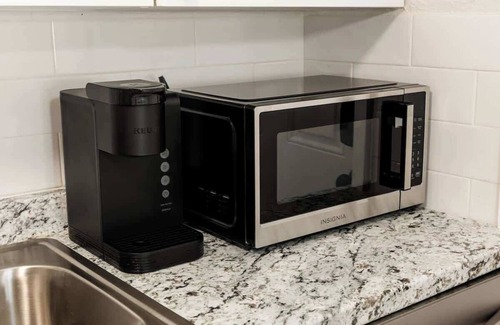 The kitchen is fully equipped with everything you need to whip up your favorite meals, including a stove, refrigerator, microwave, and coffee maker.