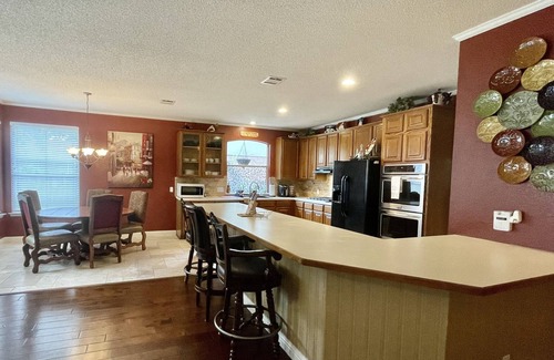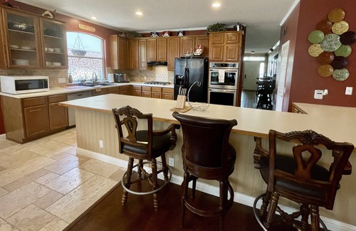 Our spacious, open floor plan has hardwood flooring, and Travertine tile in kitchen. Fully stocked kitchen for cooking and enormous island for gathering while cooking. Also we have a coffee bar stocked and ready for when you wake to enjoy! You will find our family room cozy with fireplace, reclining sofas, 55" TV with surround sound, ROKU streaming direct TV, Netflix, Amazon, and high speed internet for your entertainment. Master Suite has a very comfortable King Size bed with Tempur-Pedic mattress, bathroom with shower, large jetted garden tub, and dual vanities. There is an attached bedroom / office to the master suite with a day bed that can be used as two twin beds or put together to create another king size bed and backyard access. the 3rd Bedroom is at the front of the house has a queen size bed and built in book shelves and desk. 4th bedroom has a queen size bed, 5th bedroom you will find two comfortable twin size captains beds with pillow top mattresses. The game room is located upon entry with a full size pool table, poker table, dart board, big screen TV and sound system. Hall bathroom has tub/shower/double vanity. Towels and linens included and brand new! Make our comfy fun home your home away from home!