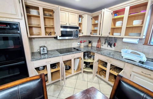 The kitchen comes equipped with everything you need—cookware, oven-safe dishes, a vegetable steamer, wine glasses, beer mugs, utensils, and more.