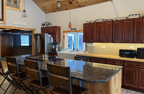 There is plenty of entertaining space inside and out. The backyard is equipped with a wooden playground, picnic area, and fire pit. Renters will have access to an outdoor flattop grill, an open concept kitchen with updated appliances, and a wood burning stove.