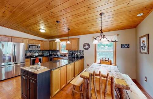 Inside, the first level of the home features a full kitchen with elegant marble countertops and stainless steel appliances. Adjacent to the kitchen, the open-concept living room invites relaxation with plenty of seating, a wood-burning fireplace, a large TV, and stunning views of the wooded mountains. Three of the home's bedrooms are located on this floor, each beautifully decorated with wilderness-inspired touches, abundant natural light, and comfortable linens. Off the primary bedroom, you'll find a luxurious jacuzzi tub with TV access—perfect for a relaxing soak while streaming your favorite shows.