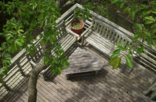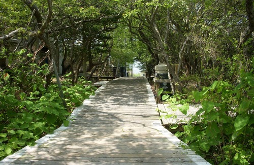 The house is on a barrier island, nestled in a lovely grove of holly and cherry trees, steps from the Great South Bay and Atlantic Ocean, surrounded by many miles of Watch Hill National Seashore Wilderness.