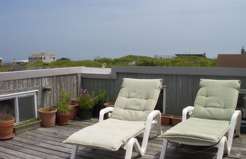 Great house for friend or family reunions! 5 bedrooms with 2.5 baths. 4 full and 4 single beds make for flexible sleeping arrangements. Unique mix of private and party space. One-minute walk to Bay or Ocean. House is airy and open with a roof deck, large deck off the common room and spacious screen porch. Wifi. Well equipped kitchen with cookware , dishware and dining table for 12 to 14. Dishwasher, microwave, coffee and espresso maker, blender. Gas and charcoal grills. Laundry room with washer and dryer. Large outdoor and indoor showers. Sheets and towels included. Pets welcome.