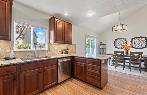 Charming South Meridian retreat! Nestled on a dead-end street, this comfortable home offers an inviting stay with tall vaulted ceilings, open bright living space, granite countertops, and cozy seating around a 70" TV. Step outside to enjoy the deck and paver patio with a cozy fire pit under café lights, surrounded by lush landscaping. Ideally located with quick access to The Village, Roaring Springs, and the entire Treasure Valley, this home is perfect for both relaxation and adventure.
