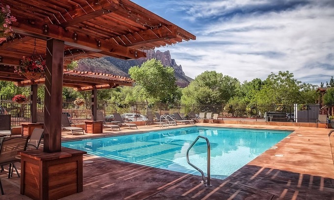 Best-rates for the Zion National Park South Entrance hotel starts from $311 per night with includes Air Conditioner, Bedding/Linens, Wellness Facilities, Guest Services, Internet, TV, Accessibility, Fireplace/Heating, Pool, Parking, Wheelchair Accessible, Security/Safety, Child Friendly, Kitchen, Laundry StayAndPlay offers fully equipped golf villas, golf hotels, golf resorts, luxury golf cabins, and exclusive golf retreats, making it easier than ever to find your perfect golf escape — ideal for families, peaceful getaways, or pet-friendly retreats with the whole crew.
