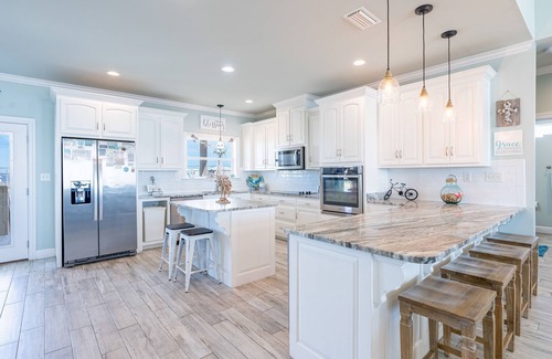 This spacious, custom-built beach house is ready to be your next getaway at the Gulf. Located directly on the beach, this home features designer furnishings throughout, four bedrooms and baths, a fabulous great room with a 65' flatscreen TV, and a gourmet kitchen with stainless steel appliances, a granite island, and a breakfast bar. The two Gulf-facing bedrooms have plush king-size beds, and sliders leading out to the large open and covered decks. Guests will also enjoy free WiFi, Direct TV, and smart TVs in all the bedrooms. The underside of the home is well lit with a boardwalk from the front to the back complete with swings for both kids and adults, a sandbox, BBQ area, and an outdoor shower.