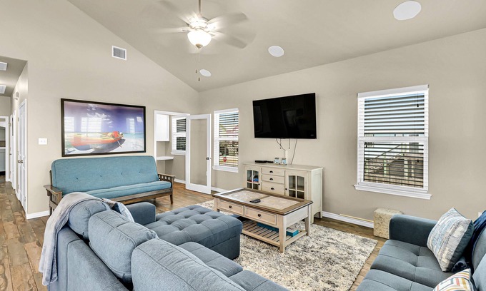 This bayfront retreat offers direct access to the sandy beaches and a convenient location less than a mile from the USS Lexington, just over a mile north of the Texas State Aquarium, within a few miles to Indian Point Pier for fishing, and two miles north of Hurricane Alley Waterpark and downtown Corpus Christi.