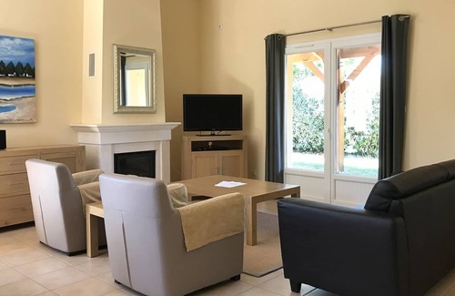 Layout: Ground floor: (open kitchen(boiling water tap, toaster, coffee machine, oven, microwave, dishwasher, fridge-freezer), Living/diningroom(TV, dining table(6 persons), fireplace, seating area(6 persons)), bedroom(single bed(90 x 190 cm), single bed(90 x 190 cm)), bedroom(single bed(90 x 190 cm), single bed(90 x 190 cm)), bathroom(bathtub with shower, toilet), bathroom(shower), toilet(toilet, toilet)) dining table, stove, bathtub or shower, heating, terrace, garden, bicycle storage, garden furniture, BBQ, parking, swimming pool(shared with other guests, including separate children’s swimming pool (depth 50cm)), boules court, bicycles available, ironing board, iron