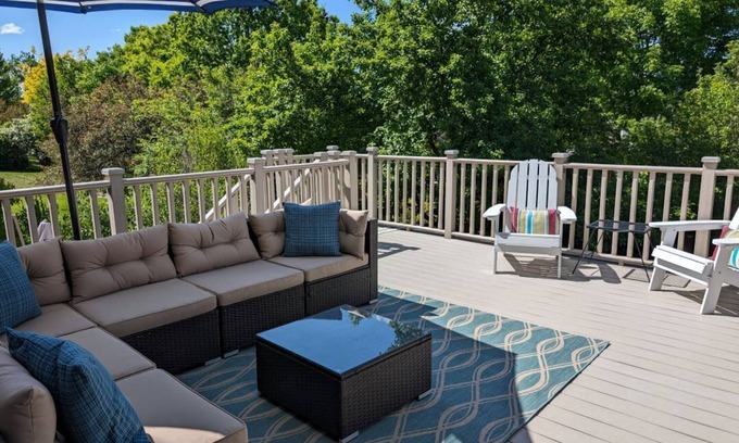 Backyard Oasis: Enjoy the spacious backyard with a large deck, gas firepit, gas grill, hot tub and outdoor seating.