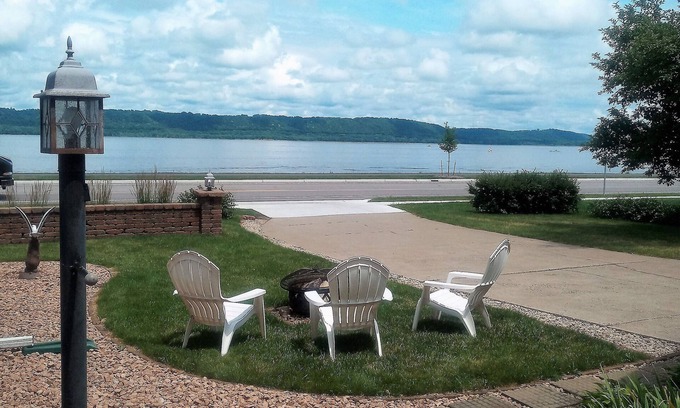 Outside you'll find lots of outdoor seating, two fire pits, a weber gas grill and a patio table with umbrella. This arrangement offers the perfect outdoor setting to relax, relive the fun day and to enjoy family, friends and the dramatic view of Lake Pepin all over again!