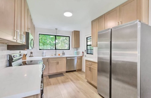 Modern Kitchen: Fully equipped with all the essentials for preparing meals, the kitchen includes a fridge, stove, microwave, and coffee maker, making it easy to dine in.