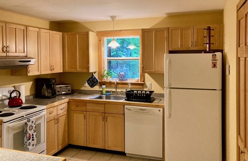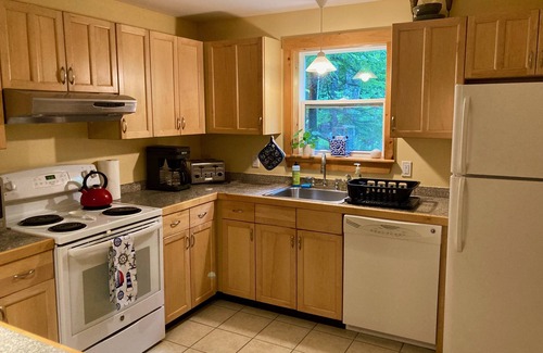 Bright and spacious home nestled in the woods abutting Acadia National Park. Located on the quiet side of Bar Harbor away from the hustle of busy day traffic, but only 3 min from downtown. Built by a local as a family home in 2005, this house has all the comforts of a new home with all the charm of a well-loved Maine cottage. Enjoy the giant, light-filled living room stocked with books and games, have coffee in the cozy breakfast nook tucked up against the woods, or take advantage of the fully stocked kitchen. There is a beautiful view of Champlain Mountain from the house, which boasts amazingly colorful sunrises and sunsets easily seen from the deck.