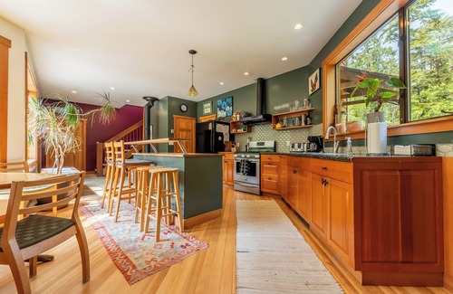 Nestled on an acre of old growth rainforest, this home accommodates families and groups of 7 with spacious living inside and out. Kitchen is set up for family cooking and enjoying, bedrooms are large. The pedestrian and bicycle pathway in front of the property leads to beaches, restaurants and shops, as well as downtown Tofino, 6kms away. Tofino's Visitors Centre is located one kilometre away. Great beach and surfing neighbourhood, some guests spend their stay with just bicycles! Fire pit outside has furniture around it, large garden and lots of parking. This vacation rental is registered with the District of Tofino as a Vacation Rental business with the appropriate licensing.
