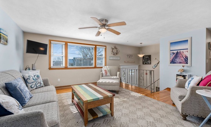 There's plenty of room to spread out here! Home has central AC with ceiling fans in the 3 upper level Bedrooms. Stroll to the Sandwich Village, Cape Cod Canal, Glass Museum, mini golf and etc.
