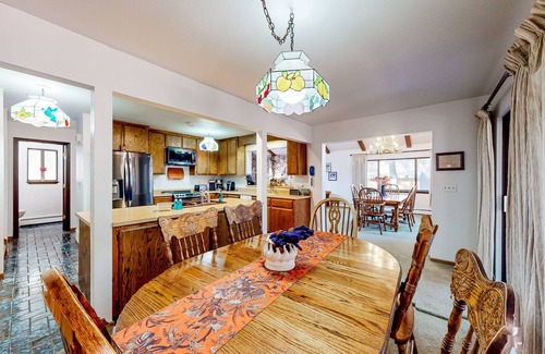 This spacious wilderness retreat is as peaceful as it is convenient. With your loved ones by your side, listen to the river's serene trickling from the patio as you gaze out at the local flora and fauna. Walking inside, retro living and modern amenities blend together in perfect unison. Under vaulted ceilings, the spacious living room displays a stone-surrounded wood stove, plush sofas, and plenty of natural light. Steps from here, the updated kitchen displays stainless steel appliances and ample meal prep space. When it's time to eat, dining is made easy at one of the two wooden dining tables.