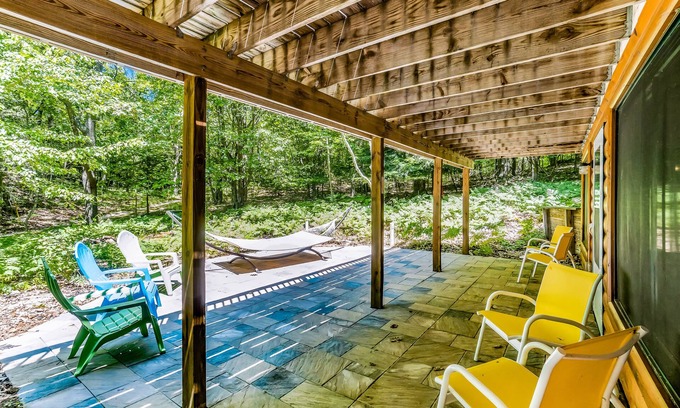 Inside, you'll find a bright interior with lots of natural light. The living room invites you in to lounge on the sofa and have a great conversation, or cozy up next to the fireplace. The chef of the group will love how much space there is to maneuver about the kitchen, complete with a breakfast bar. With three bedrooms and extra sleeping space, there's more than enough room for you and your loved ones to get a comfortable night's sleep from the day's adventures. Gently rock your day away on the hammock or tell ghost stories out at the fire pit until the stars come out to dot the sky. Take your morning cup of coffee or tea to the furnished deck or patio and take in the spectacular wooded views.