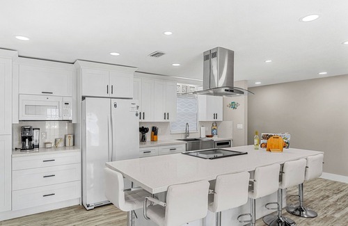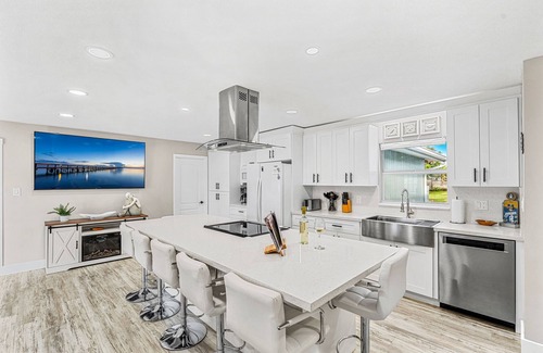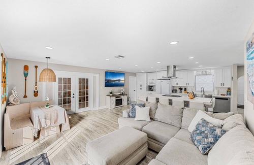 This radiant 4-bedroom vacation rental is a true coastal oasis, nestled just moments away from the ocean and soothing waves. Immerse yourself in the ultimate beach experience with this bright and spacious retreat that promises relaxation and memories to last a lifetime. Step inside to discover a sunlit haven, where the open-concept living area is designed for effortless entertaining and family gatherings, offering a seamless flow from the fully equipped kitchen to the comfortable living room.
