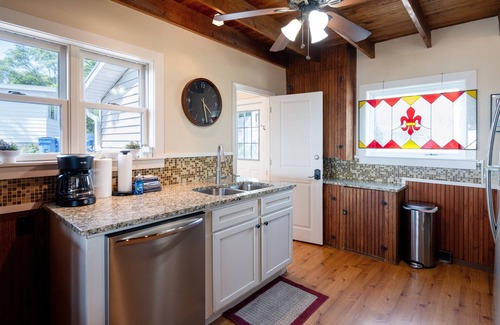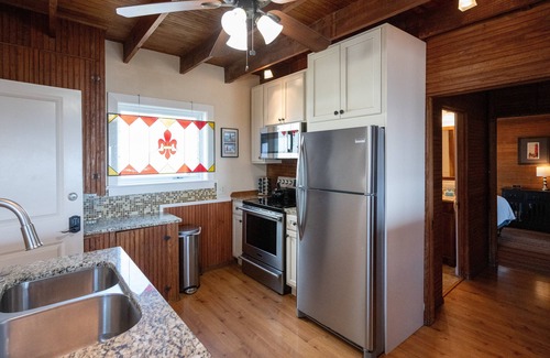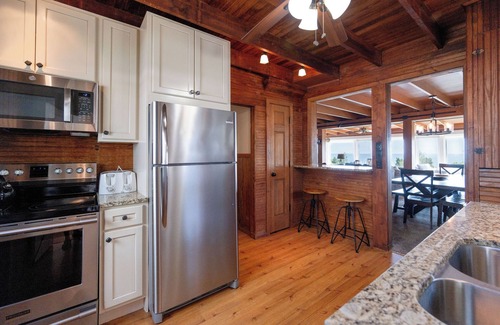 The fully equipped kitchen features stainless appliances and plenty of counterspace. Convenient main floor bedroom has a queen bed and access to a full bath. The upper level provides plenty of sleep options - a guest room with a queen bed, an additional room with a queen and twin bed , a cozy bedroom with two twin beds and an additional room with a full size bed. These rooms share an upper level full bath. The front porch also provides a twin bed with twin trundle.