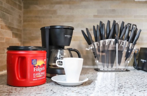 The kitchen is fully stocked with appliances and includes a complimentary coffee/tea/ wine bar!