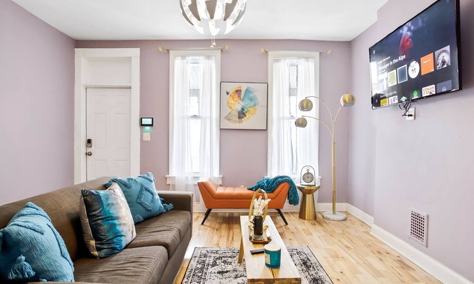 Have fun with the whole family in this stylish home! Located in a friendly residential neighborhood, it’s perfect for a couple, family, or small group! As you walk in, the 1st floor is filled with cheery colors to greet your party. The living room is comfortable and cozy. The dinning room is great for group dinners. The modern kitchen is fully stocked with all the utensils used to cook a great homemade meal (or to reheat one that’s been made for you at any of dozens of restaurants close by).