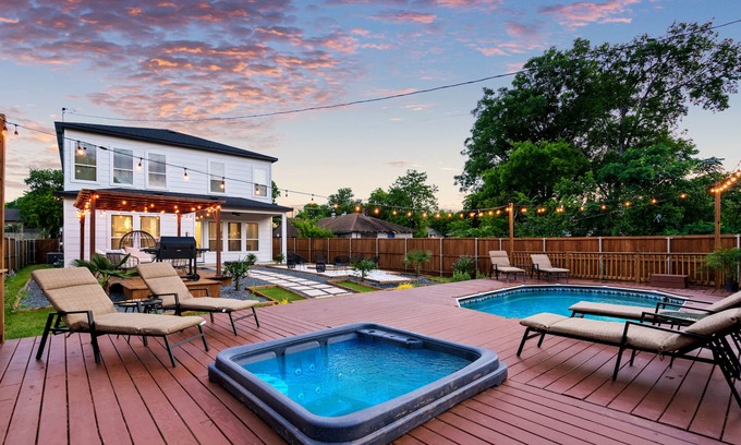 This bohemian home with tropical vibes is the perfect getaway for your next trip to Dallas! Located only a few miles away from downtown & Bishop Arts, spend your days exploring the city and your nights relaxing in this beautiful backyard that features a pool and jacuzzi! Take advantage of the outdoor grill & indoor full kitchen and host a cookout this summer in this stylish home! Featuring 5 bedrooms & 9 beds and an instagrammable grass wall, bring your family and friends for a luxurious stay!