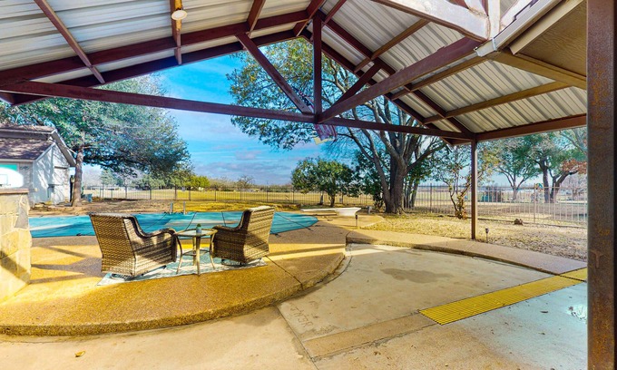 True Texas charm abounds at this gorgeous golf course-view getaway in Stephenville. Centrally located in the heart of the 'Cowboy Capital of the World', this spacious retreat boasts an incredible outdoor area overlooking one of the greens at Legends Country Club. The eight-foot private pool is available during peak season, while the deluxe outdoor kitchen/bar comes fully equipped for year-round entertainment. Highlights include a mounted smart TV, an electric fireplace display, multi-function grill features, refrigerated storage, and plenty of counter space. As an added perk, golfers in the group will enjoy special group rates on tee times.