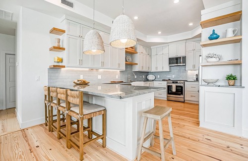 Back at your home away from home, spread out within the multi-levels, and get comfortable. The main living area boasts an open layout with a stylish living room and a well-equipped kitchen. The chef of your group will adore cooking amidst the kitchen's gleaming countertops, stainless steel appliances, and tile backsplash. When it is time to eat, the adjacent dining table is large enough for everyone to gather.