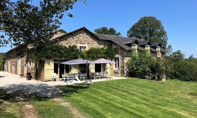 In the heart of Limousin, in a very quiet and green setting with a view, ideal for walks and relaxation, the place called "Les Gannes" is a former farm on a 2.5-hectare property. The spacious house (over 500m2) has three living rooms, two adjoining living areas, two bathrooms, and nine bedrooms, accommodating a total of 20 guests. Perfect for large groups, small events, as well as for more intimate weekends! The accommodation sleeps up to 20 guests across 9 bedrooms: There are 8 queen-size beds (160x200 cm), 1 double bed (140x200 cm), and 2 single beds (80x200 cm), plus several extra single mattresses (80x200 cm). All beds will be made up for your arrival. Kitchen towels are provided. The “household linen” option gives you access to bath towels. The house consists of two adjoining parts: the original farmer’s house with 5 bedrooms, and a converted former barn with 4 bedrooms. Together, they offer 2 bathrooms, a laundry room with a washing machine, 2 fully equipped kitchens, 3 living rooms, and 2 connecting dining rooms with everything you need for large group meals. Extras include a juicer (on request), two raclette machines, a crepe maker (on request), and two bread machines. In the living room, you’ll find books (comics, magazines, novels…), children’s books and games, board games, puzzles, and arts & crafts supplies. High-speed fiber internet is available free of charge. To enjoy the outdoors, there’s a large table for group meals, a gazebo, a barbecue, lawn games (Mölkky, pétanque, etc.), deckchairs, a sunbed, and a firepit (on request) to brighten up your evenings! To respect the neighborhood, we ask that music and noise be kept indoors after 10:30 PM. Upon request, we can also arrange babysitting services with local young women from the village. The house is located in a peaceful rural setting, just 5 minutes from local shops (butcher, bakery, general store), 15 minutes from full-service supermarkets, and 10 minutes from a quality catering service. In 15 minutes, you can explore the historic town of Saint-Léonard-de-Noblat, swim in natural spots like Lake Vassivière, or visit the Reynou wildlife park. In 25 minutes, you’ll be in the heart of Limoges and its stunning train station — considered the most beautiful in France! And for true nature lovers, the Millevaches plateau is just 30 minutes away, where you’re more likely to meet cows than people. I am delighted to welcome you! For the organization of events/parties where guests join you during the day, we request the reservation of the cottage at its full capacity (20 beds).
