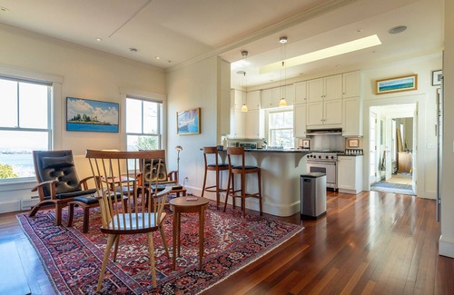 The second floor, with views of Camden Harbor and Penobscot Bay, has the living room, sitting room, kitchen, dining room, and a bedroom with a queen-sized bed and an en-suite full bathroom.