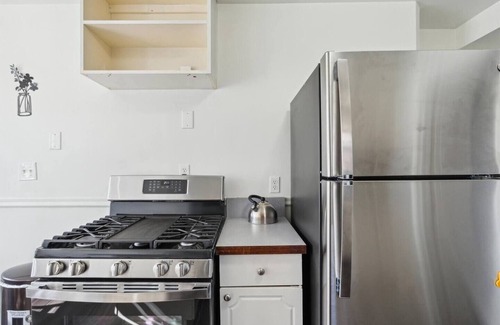 Fully equipped kitchen with stainless steel appliances including a refrigerator, stove, oven, microwave, and dishwasher.