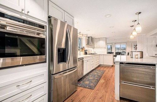 • A chef’s dream, the gourmet kitchen comes equipped with quartz countertops, a premium Wolf cooktop, and all the tools you’ll need to prepare meals together. A second fridge and two laundry areas help make longer stays comfortable and convenient.