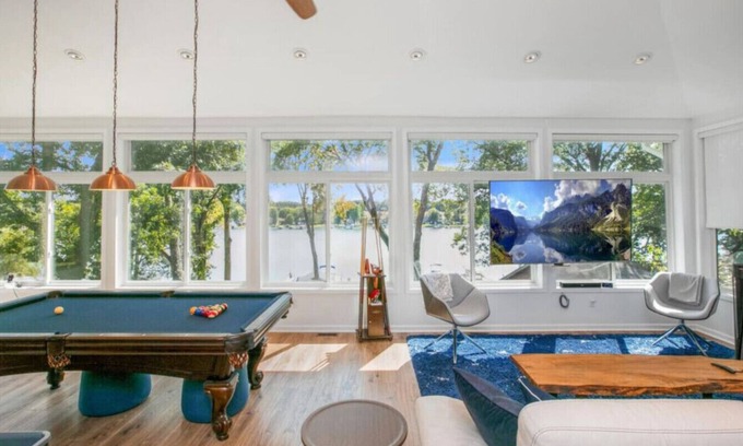 • The bright and airy loft family room features windows on three sides, letting in gorgeous lake views and natural light. It’s perfect for reading, enjoying coffee from the dedicated coffee hutch, or a fun game on the Brunswick pool table.