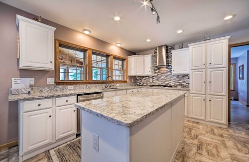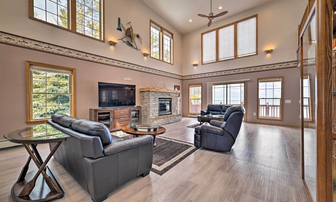 Have direct access to a scenic and private beach on Lake Huron when you escape to this expansive vacation rental in Rogers City, Michigan. Hoeft State Park and Lakeside Park are also a short drive away! Return to the home and gaze at stunning lake views from the deck and charming sunroom. In the evening, sip a drink in the home’s bar or lounge with a pet by the fireplace. This 6-bedroom, 4.5-bathroom home also features a large backyard with a fire pit, an elegant kitchen, and 2 living spaces.