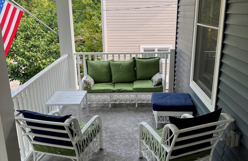 On the 1st floor, you'll find an open floor plan with a spacious living room / dining room / kitchen layout. All appliances are stainless steel, and there is a powder room off of the kitchen. French doors open up from the dining room (dining room table seats 8-10) onto a large side deck with another dining table for eight people. The front porch features comfortable seating including an oversize bed-style porch swing (our favorite spot in the house!).