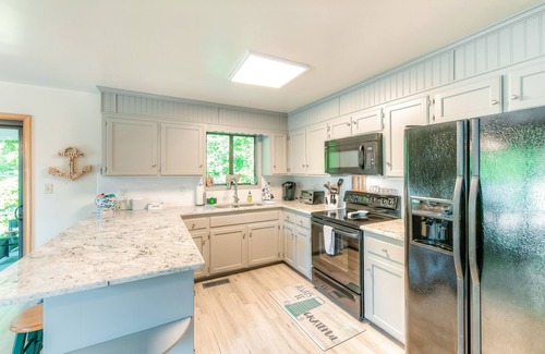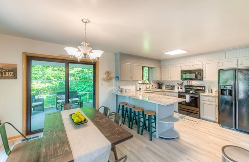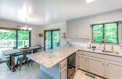 Enter the home on the main level, where you'll find an open floor plan that combines the living area, dining room, and kitchen - perfect for entertaining! The living area is ideal for bonding with your group while you watch TV, play some board games, or plan tomorrow's adventures. The kitchen is marvelous and equipped with everything you need to whip up memorable meals and delicious snacks, and there is a lovely dining area and barstools at the counter. But if have a larger crew, you can take advantage of the outdoor dining area on the wraparound deck - nothing beats dining with partial lake views! After dinner, feel free to break out one of the provided board games for a late-night challenge.
