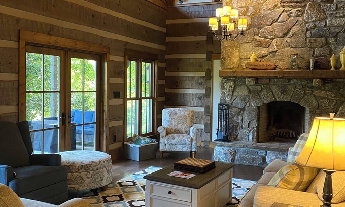 Stone porches running the length of The Lodge on both the front and back offer multiple ways to enjoy the mountain air, from rocking chairs and a hammock to seating around a fire table. Inside you'll find a comfy living area with gorgeous views of the pond just below, the rolling hills of the cove, and the mountain tops that surround you. In colder months, enjoy a fire in the beautiful wood-burning stone fireplace.