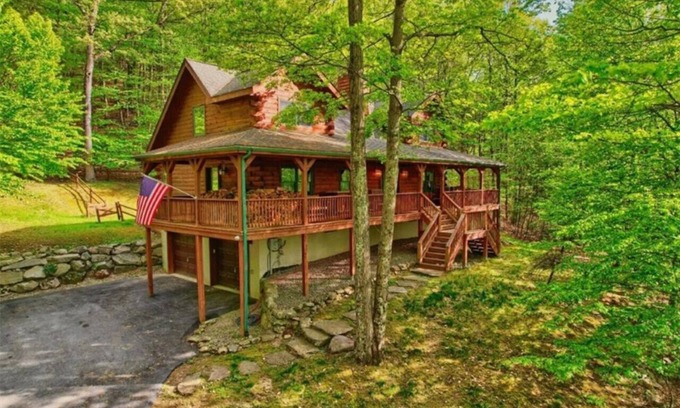 Relax and unwind in this spacious 3-bedroom, 2.5 bathroom log home. Our home offers ample space for up to 6 guests to relax and unwind amidst the serene beauty of nature. The home's warm and inviting interior features a cozy living area with a fireplace, a fully equipped kitchen, and comfortable bedrooms. Outside enjoy privacy on the wrap around front porch and an adorable treehouse for the kids.