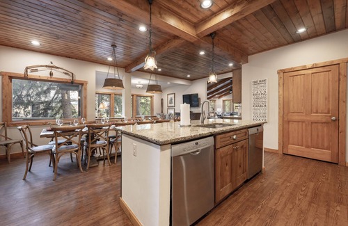 The family room is a cozy retreat with a large 60' HDTV flat screen and a grand rock fireplace. Ample seating and a queen sleeper sofa ensure everyone can relax comfortably. Guests can also enjoy multiple gathering and living spaces throughout the home, including a private hot tub, a family game room stocked with a pool table, ping pong, board games, puzzles, and an Xbox gaming system. Stay connected with wireless internet access, and take advantage of practical amenities like a 2-car garage, a spacious entrance/foyer with ample storage for skis, boots, and snowboards, a laundry room with washer/dryer, and provisions for families such as a crib and 2 high chairs. A private footbridge crossing Vasquez Creek adds to the unique charm and convenience of our property.