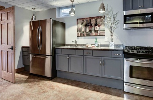 Do you like to play pool? Then you are in luck as there is a pool table in the finished basement. It can be converted to a ping pong table. There is also a second kitchen downstairs. This kitchen is not stocked for serious cooking as the one upstairs is, but if you have a large group the extra fridge/freezer, oven and microwave can come in handy (no stove top). There is also a full bath (shower) downstairs, as well as a queen bed, a twin bed, a queen futon and a double sleeper sofa.