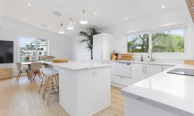 The home presents a beautiful tropical coastal design with a hint of Scandinavian. The spacious large open plan living, with extra large 40 sqm balcony capturing a gorgeous outlook overlooking Mission Bay's beach and village. Perfect for family living and absolutely ideal for business accommodation, the property features Italian brass tap-wear, Calcutta Gold marble bench tops, air-conditioning, 85” smart TV, internal laundry facilities and brand new king size and single beds and king bunks.