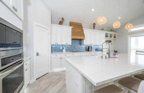 The open concept kitchen/living/dining area has plenty of space to entertain your entire group. There's seating at the giant island and dining table for everyone! With 3 spacious bedrooms and 3.5 spacious bathrooms, there are beds for 16 guests.