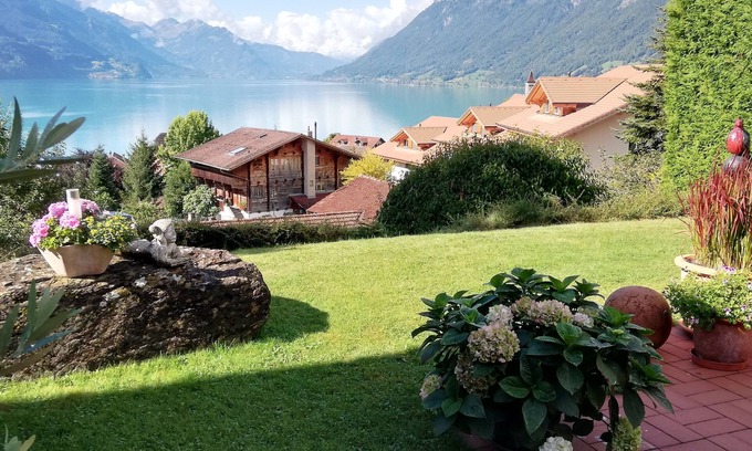 Find Serenity in a historic Swiss village nestled between turquoise Lake Brienz and majestic mountains. Brienz Villa on Alpgasse is a stylish home with truly breathtaking views and is ideal for family gatherings. The private patio with outdoor fireplace and covered dining area is a place you will want to linger; it's not just a place to sleep, but a home to truly enjoy. It is a 5 min walk to swimming spots, grocery store, and lakeside restaurants, and 12 min to the ferry/train station. Four bedrooms upstairs sleep 8 persons. Treat yourself to the luxury of a relaxing vacation and discover the Bernese Oberland from here!