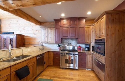 The main living area and fully-stocked kitchen are to the left of the entrance. You will have everything you need for cooking delicious meals on the gas stove, a Jura espresso steam wand machine , cast iron skillets, griddles, a coffee maker, toaster, blender and more. A small sitting area gives way to a vaulted ceiling with floor to ceiling windows and an incredible view of Mt. Whetstone. A large dining table looks over the comfortable living area with large sofa, two leather recliners, a nice remote operated gas fireplace, and large smart tv with various streaming apps installed.